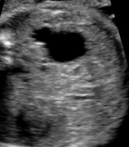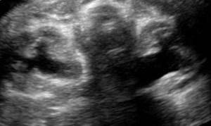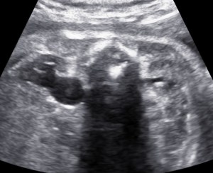 Normal appearance of the fetal kidneys in the transversal plane at 31 weeks.
