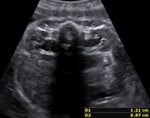 - Maximum AP RPD (Antero-Posterior Renal Pelvic Diameter) in the transverse plane with spine at 12 (or 6) o’clock.