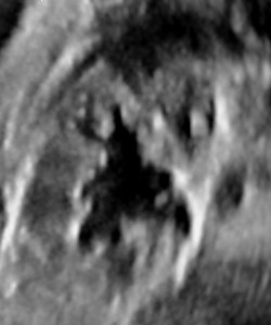 - Peripheral calyceal distention in the sagittal plane (abnormal).