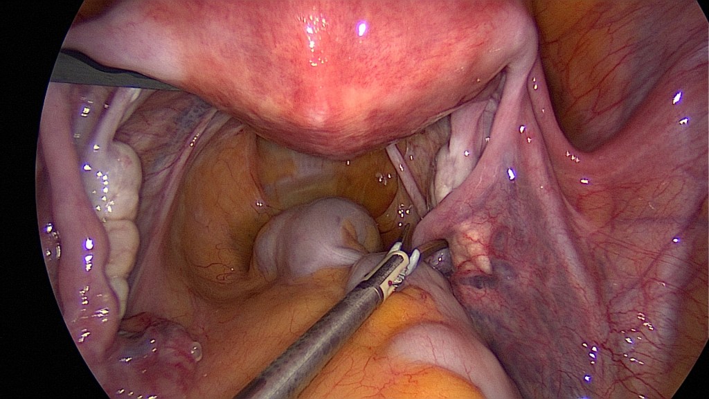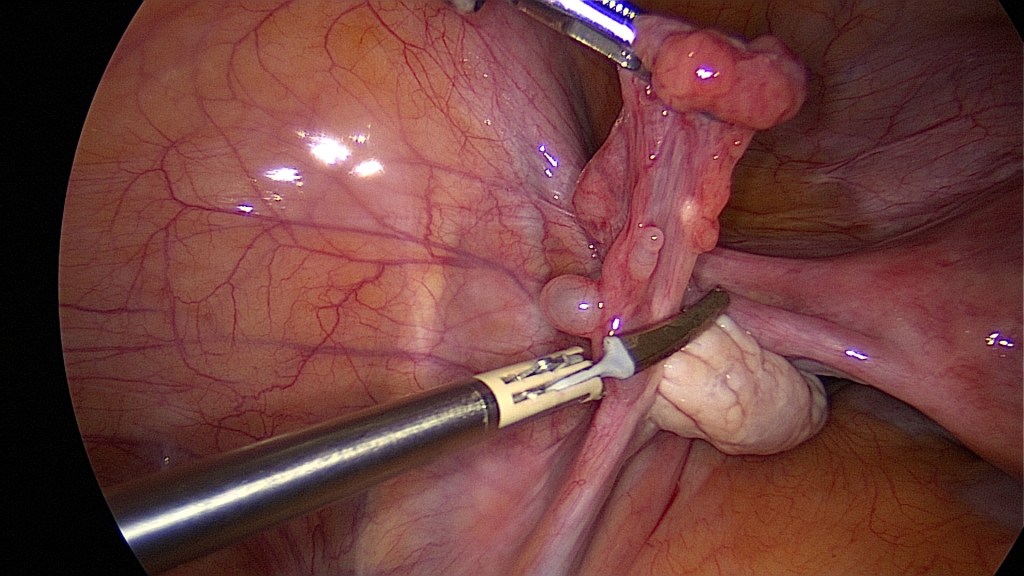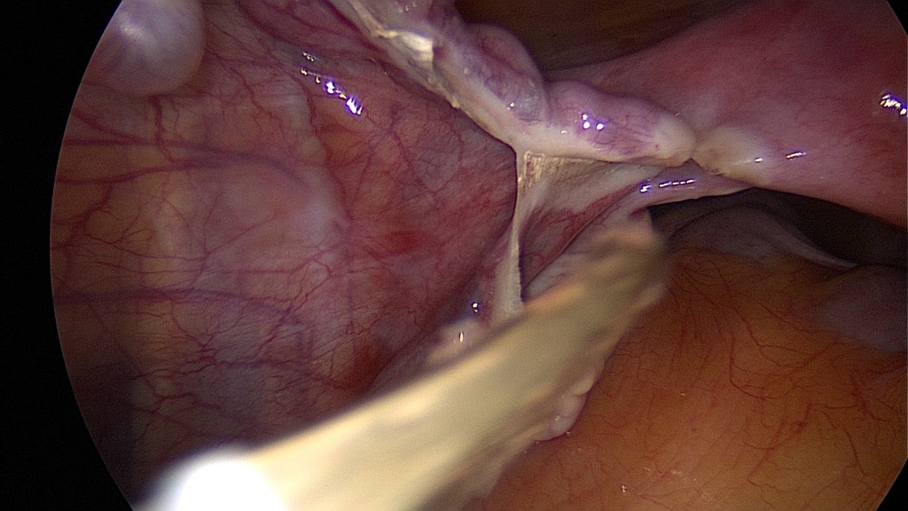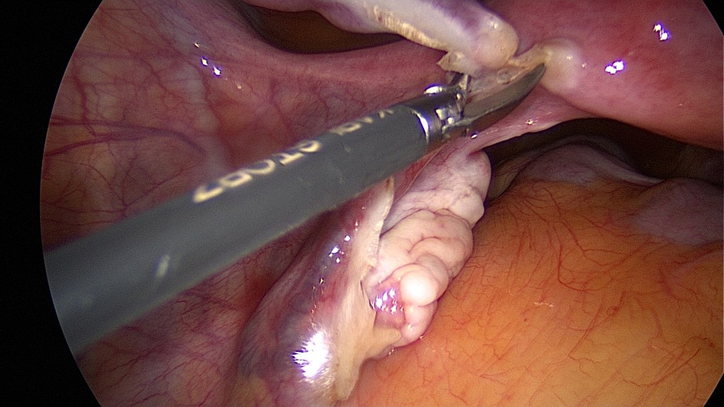 Grasping of the tube should always aim to bring the tube medially. The second grasper next to the ovary is only half-closed.