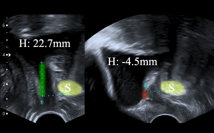 Significant bladder neck descent (ΔH: 27.2mm). Left: patient is relaxed. Right: patient performs Valsalva.