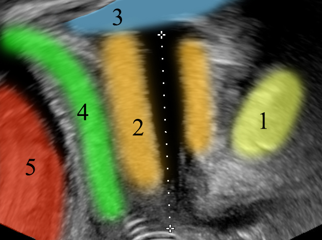 Normal urethra anatomy. 1: symphysis pubis, 2: urethral sphincter, 3: bladder, 4: vagina, 5: rectum.