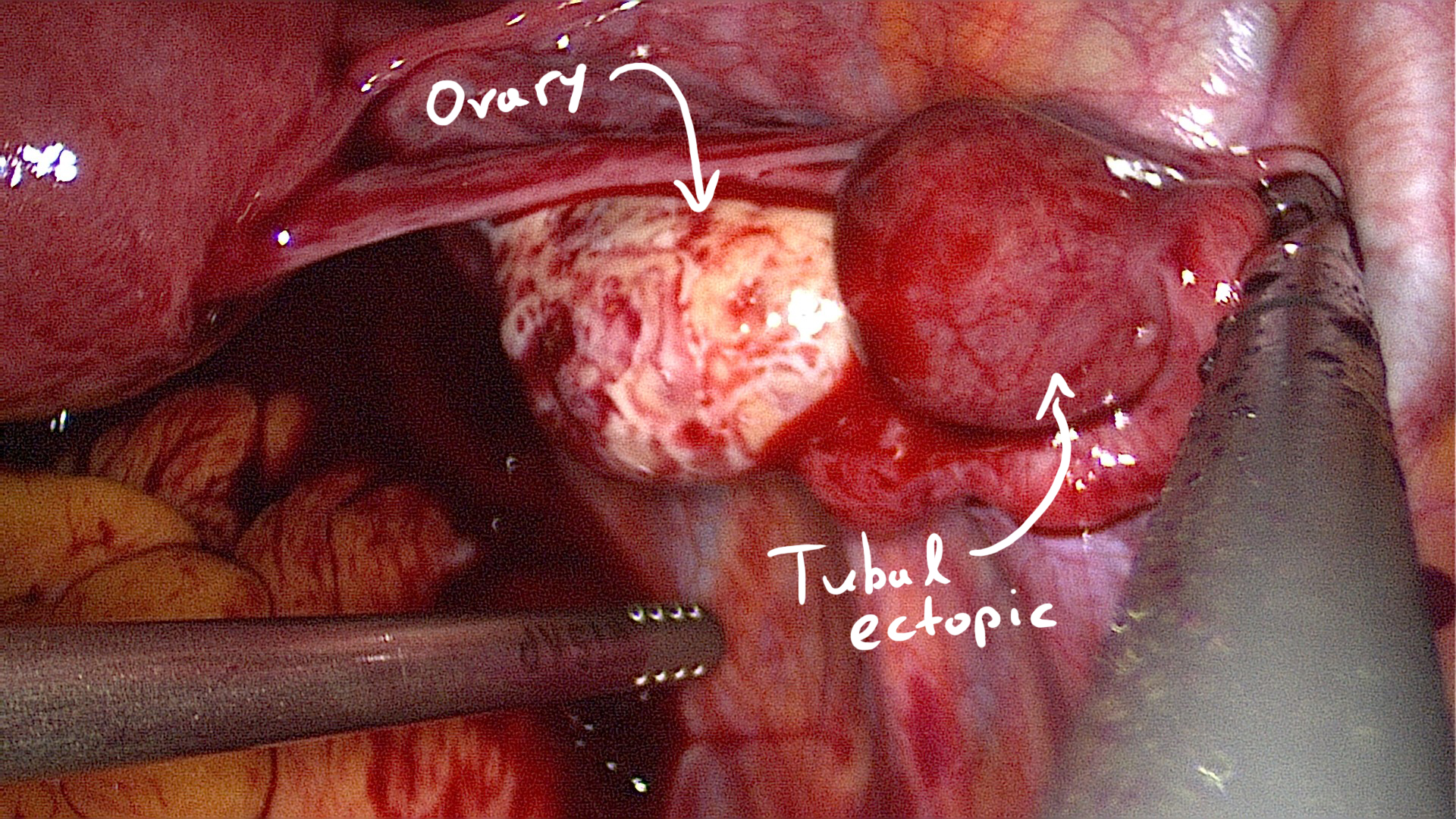 Tubal ectopic pregnancies should be identified by visualising an adnexal mass that is separate from the ovary (Elson CJ et al., 2016). The presence of this inhomogeneous mass which is clearly not a part of the ipsilateral ovary or of the uterus is called the blob sign (Nadim B. et al, 2017).