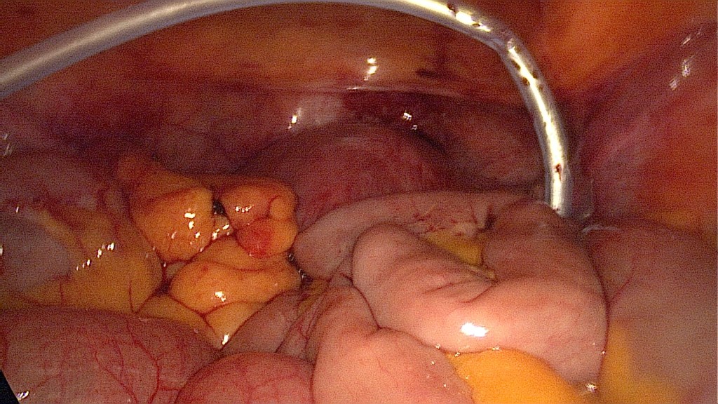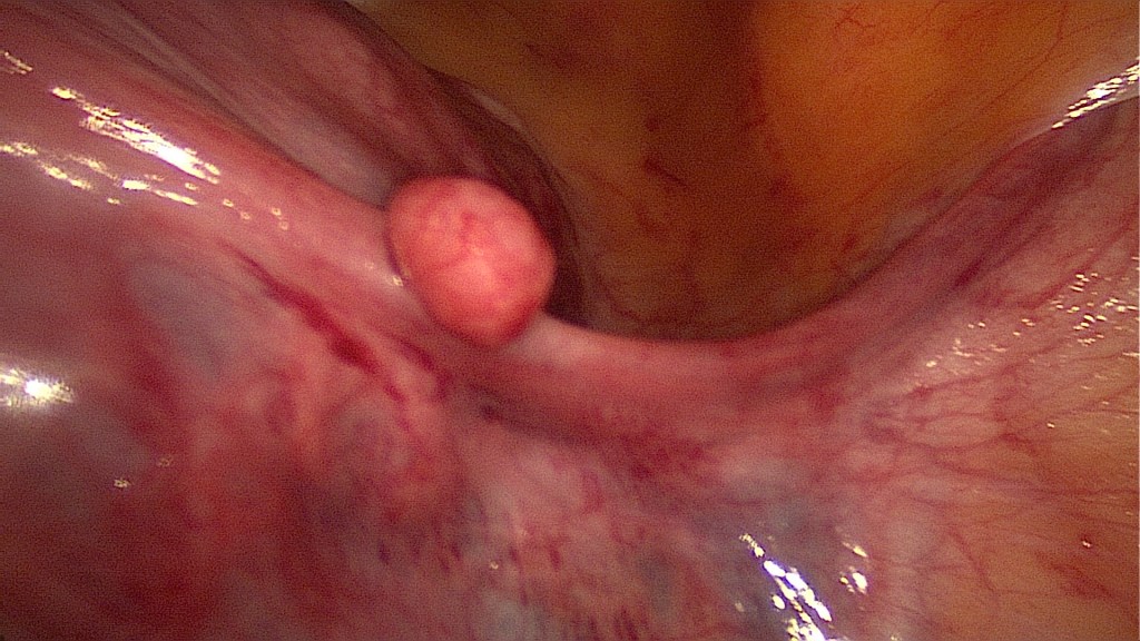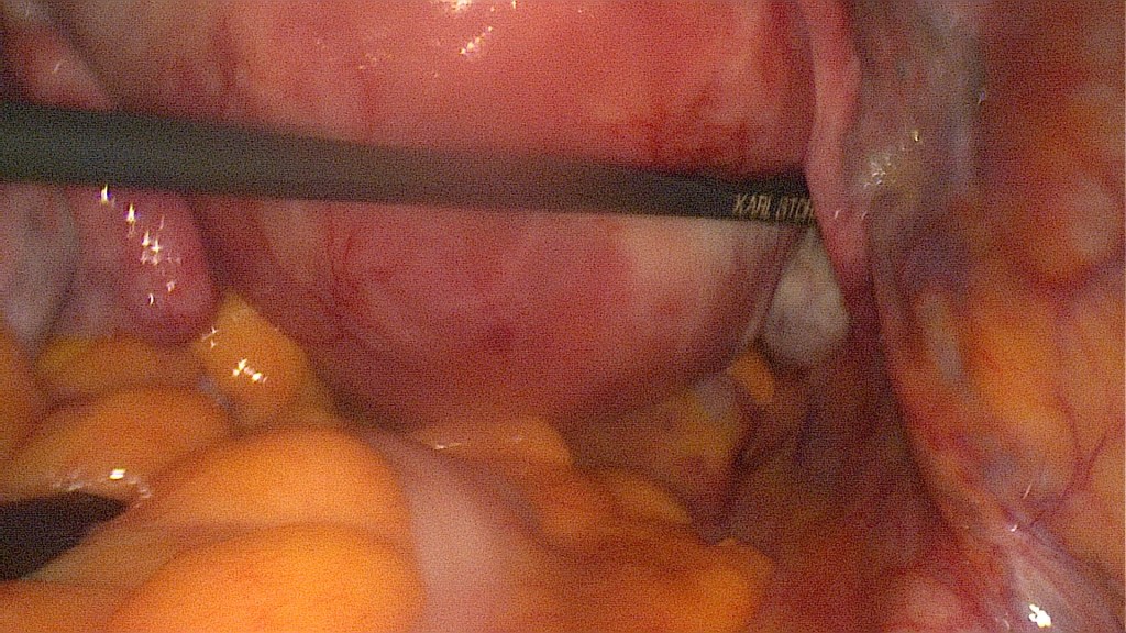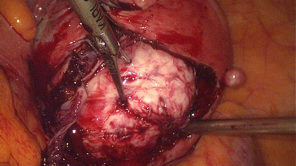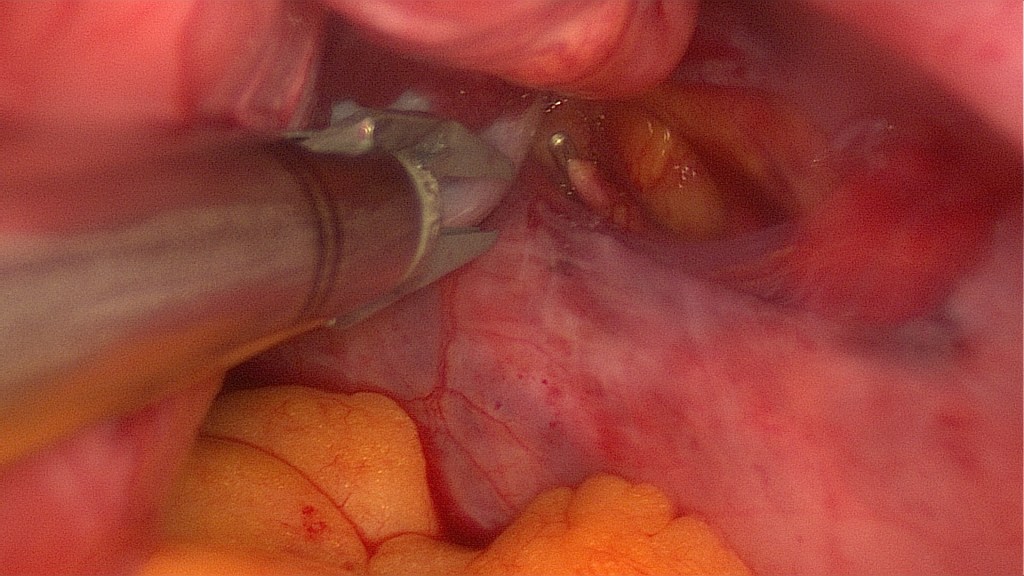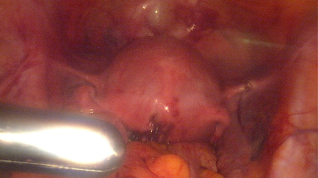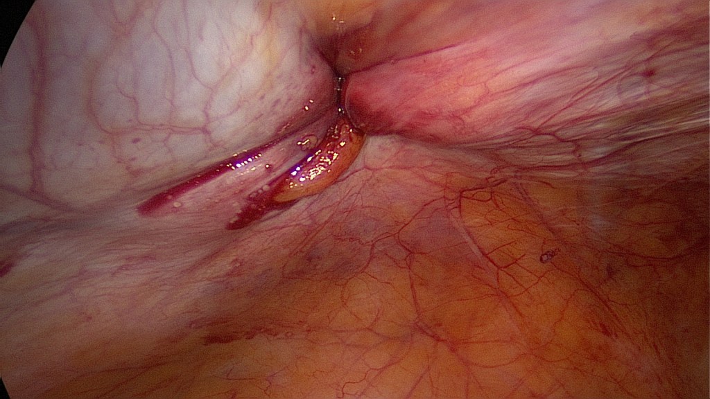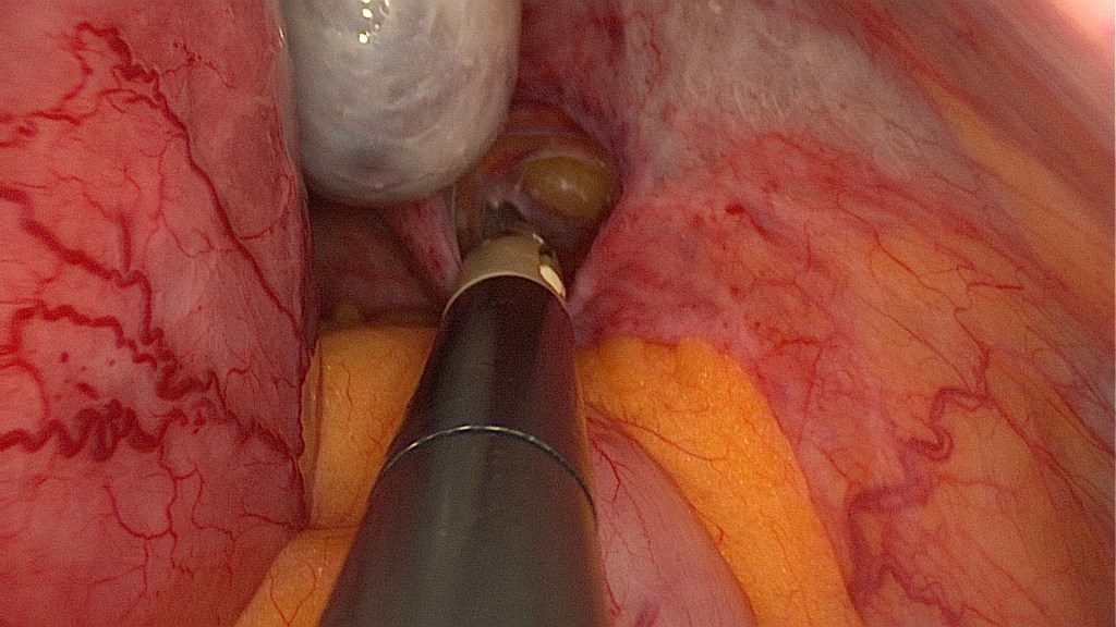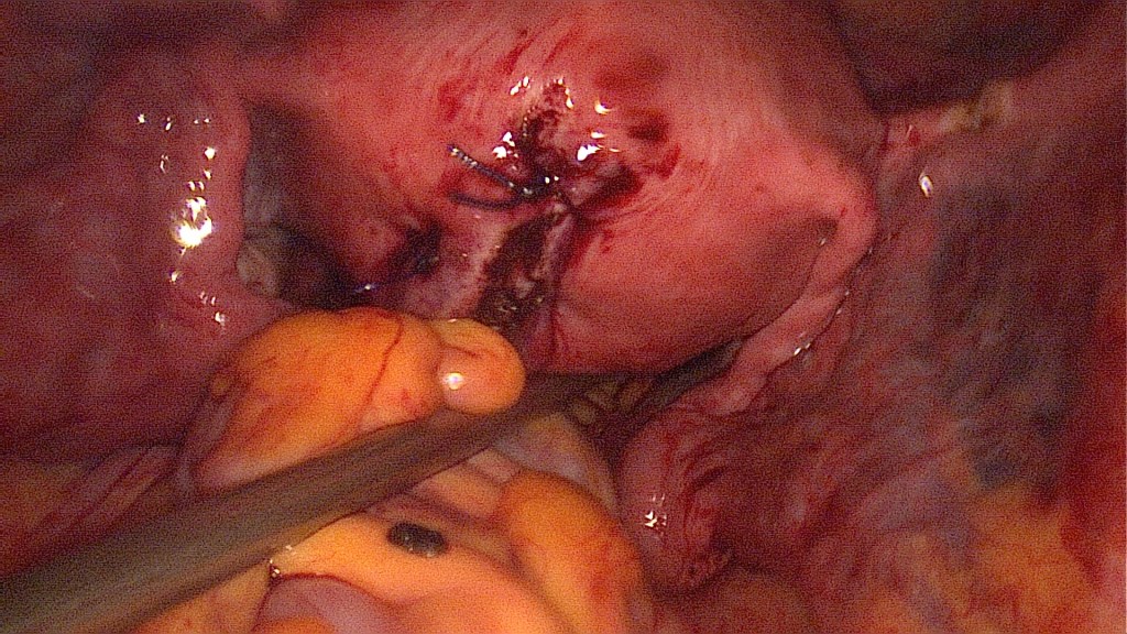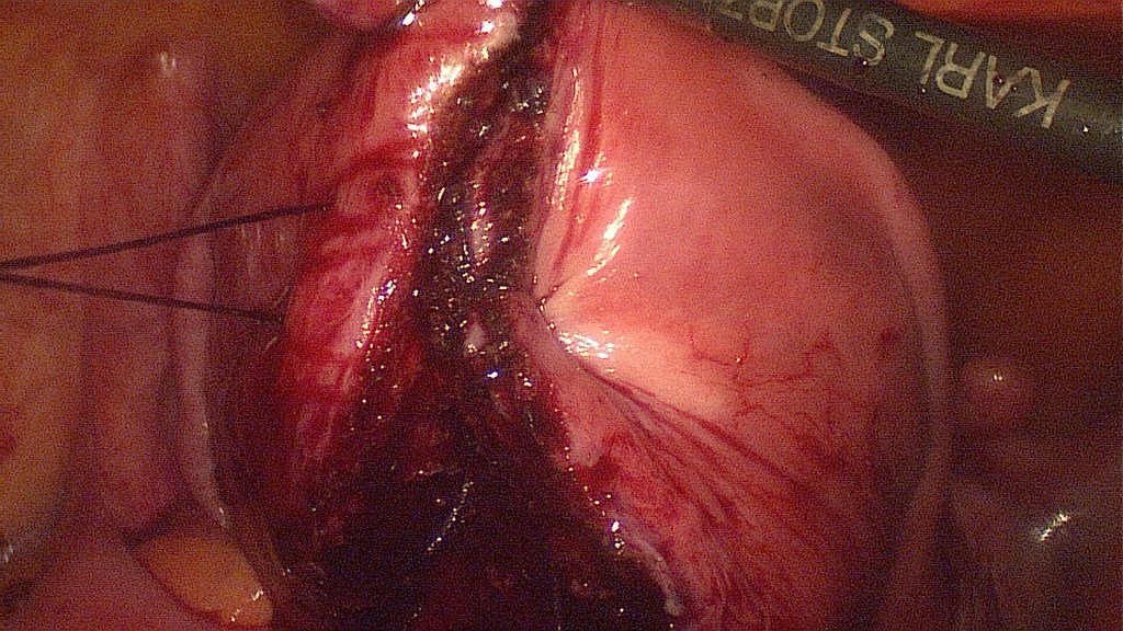 Suturing of the rectus fascia should be done in order to prevent herniation in the site of the morcellator (12mm). Here we performed endoscopic suturing of the fascia and the parietal peritoneum.