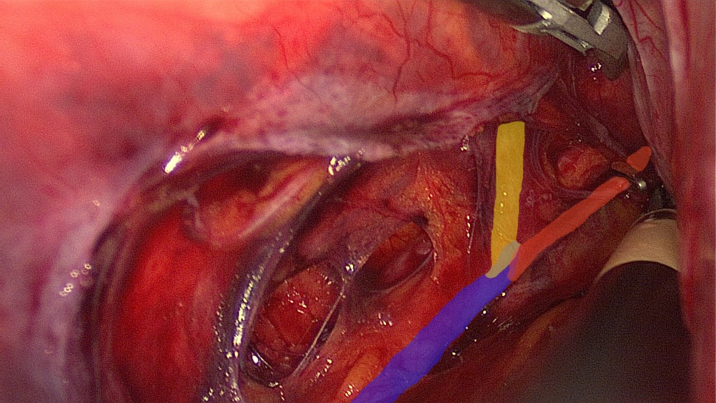 This is the same as the previous image. Blue: left internal iliac artery. Yellow: left internal iliac artery after branching of the uterine artery. Red: left uterine artery with a placed titanium clip.