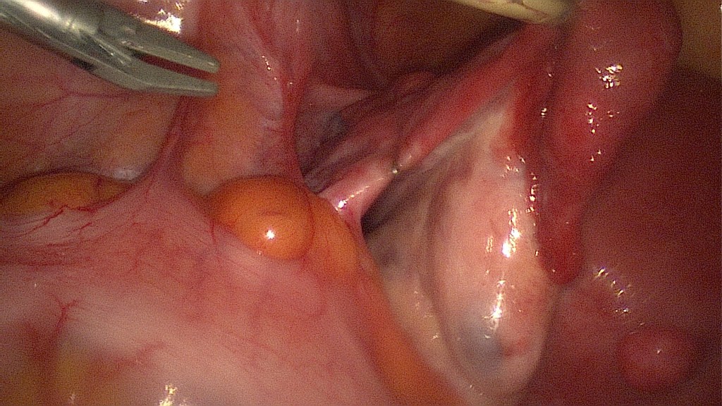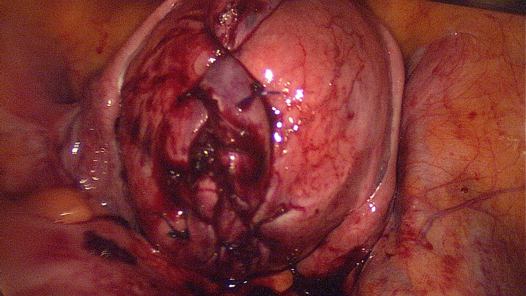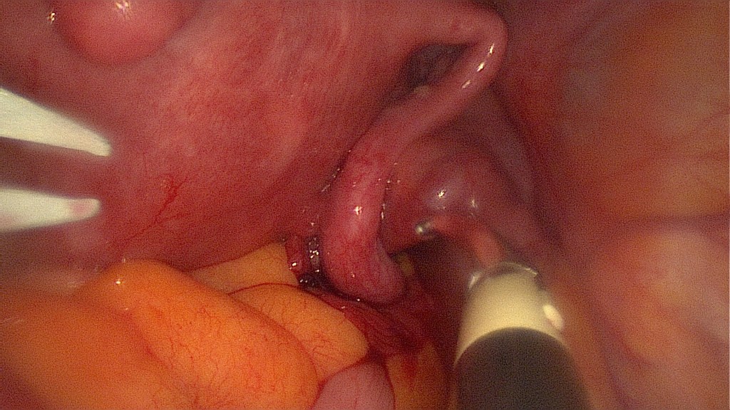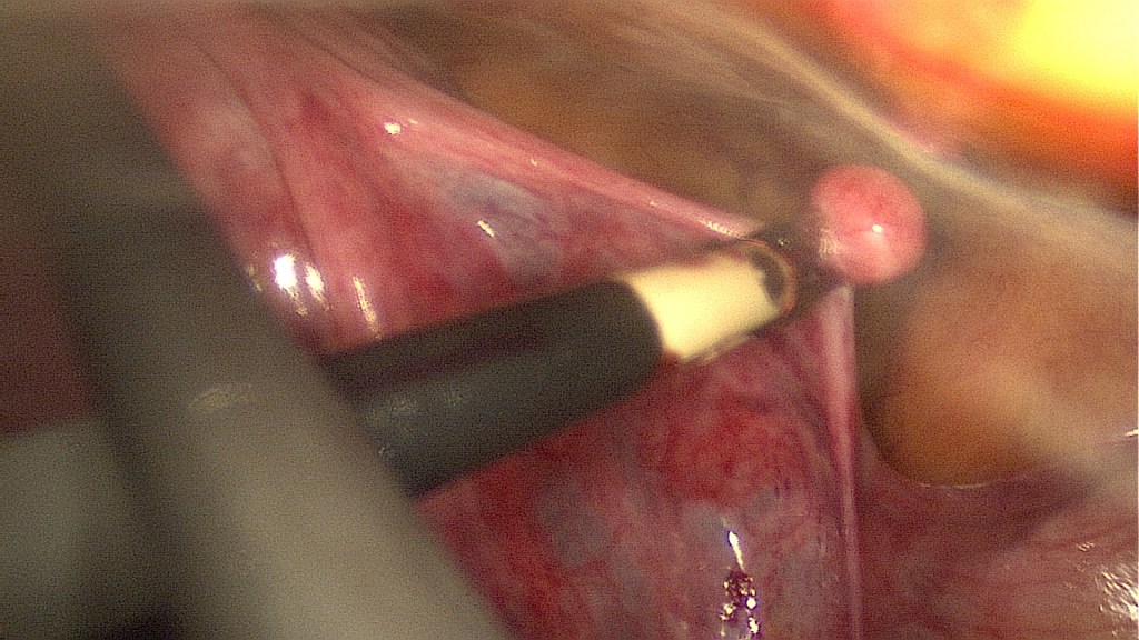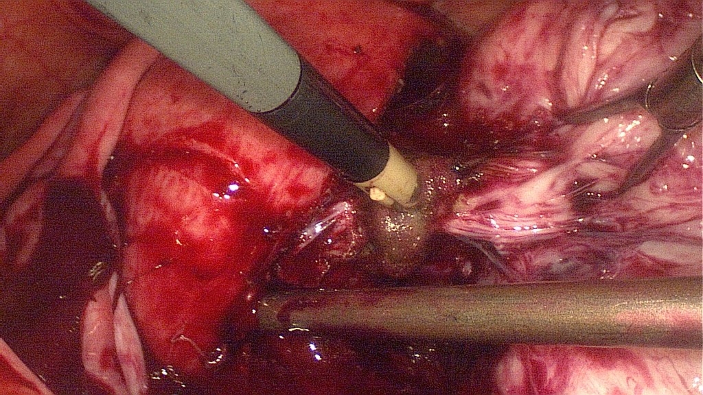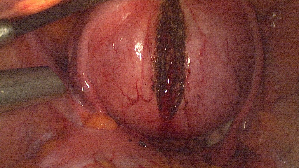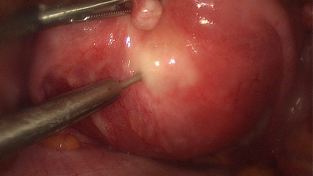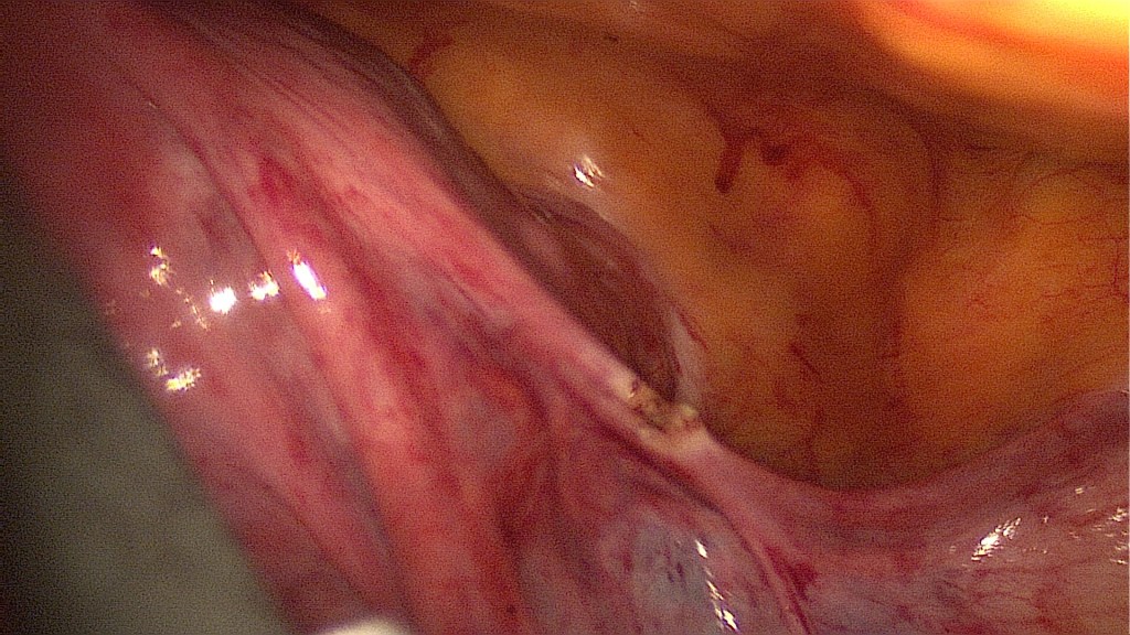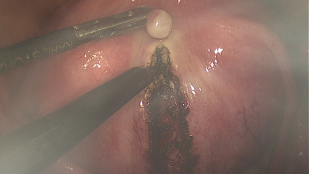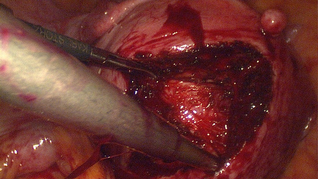 Without the use of excessive bipolar coagulation, begin of the suturing. The chromopertubation showed no opening of the uterine cavity.