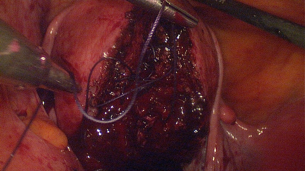 The uterine wall has been sutured in two layers with a continuous, vicryl 0 suture. A third layer with interrupted, PDS, figure of 8 sutures reassures the uterine integrity.