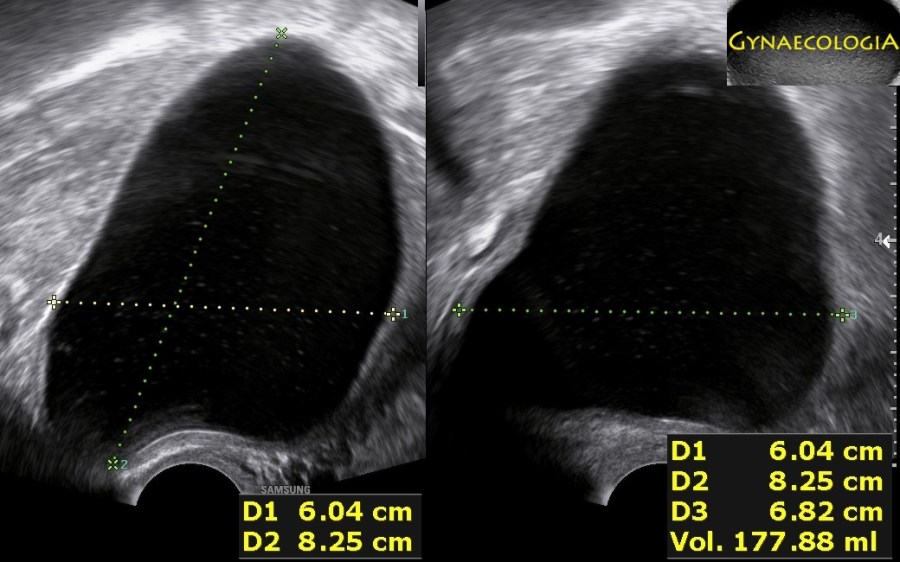 Intraoperatively we found that the left adnexa was missing. Adnexal agenesis has a rare occurence. Furthermore there was a large cyst on the posterior uterine wall, which could be succesfully excised. The cyst contents were clear. The uterine surface required suturing (3x figure of 8 stitches with PDS 0). The postoperative histology confirmed a benign, mesothelial cyst of the uterus.